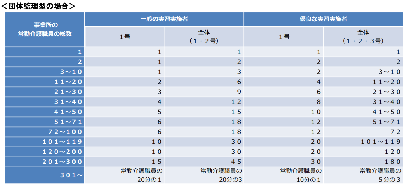 - ① 商工会議所、商工会、中小企業団体、職業訓練法人、公益社団法人又は公益財団法人 ※ 技能実習制度本体上、商工会議所、商工会、中小企業団体の場合は、その実習監理を受ける 介護職種の実習実施者が組合員又は会員である場合に限る。