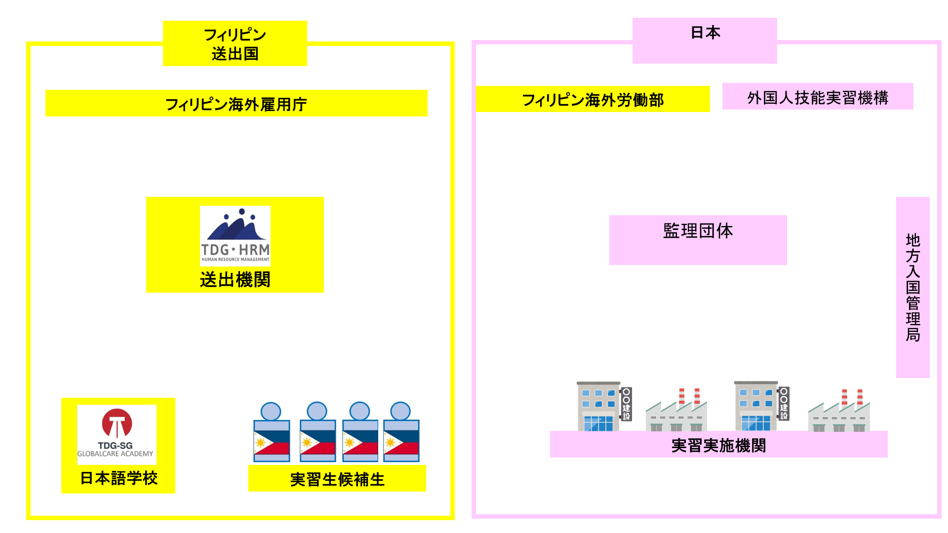 技能実習生を受け入れる時に、関わってくるのが、外国人を送り出す国の送出機関、日本の監理団体、受け入れる日本企業(実習実施機関と言います)です。その3者に、技能実習の適正な実施及び技能実習生の保護を目的として設立された法務省および厚生労働省が所管する認可法人である外国人技能実習機構(OTIT)と入国管理局が加わります。弊社はグループ会社に、フィリピンの送出機関を持っております。そしてフィリピン人技能実習生の受入れには、もう2つ、フィリピン側の監督官庁である駐日フィリピン共和国大使館海外労働事務所(POLO)とフィリピンの政府機関であるフィリピン海外雇用庁(POEA)が加わります。